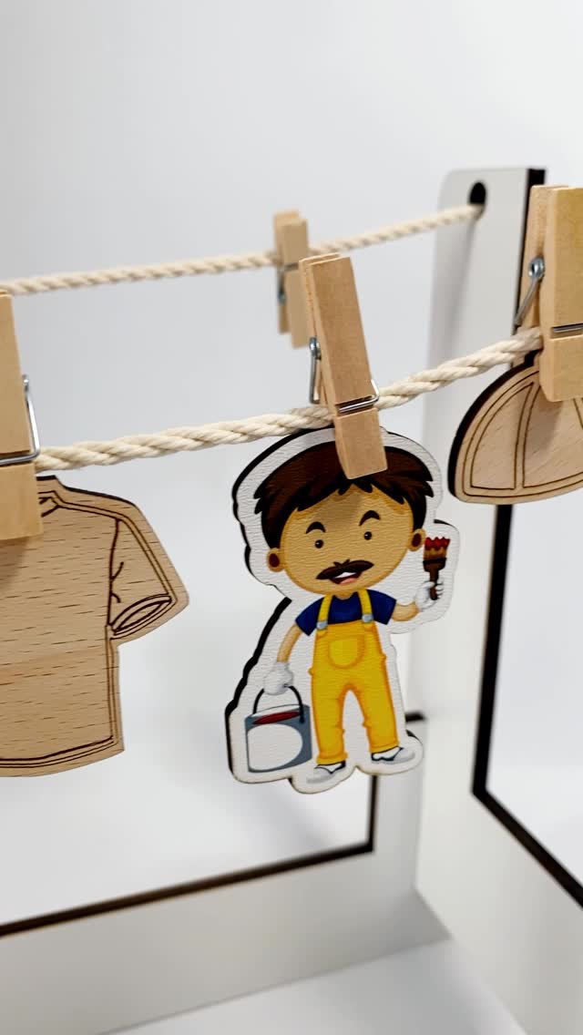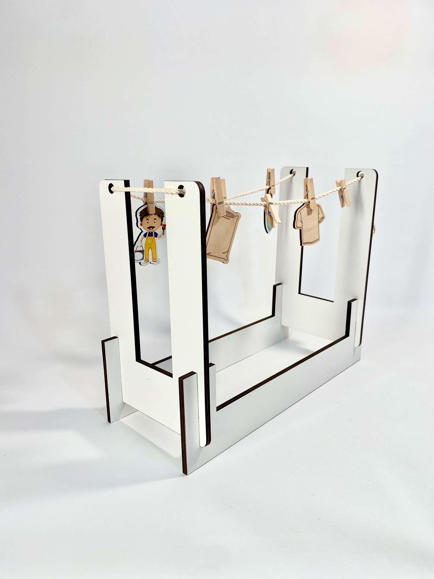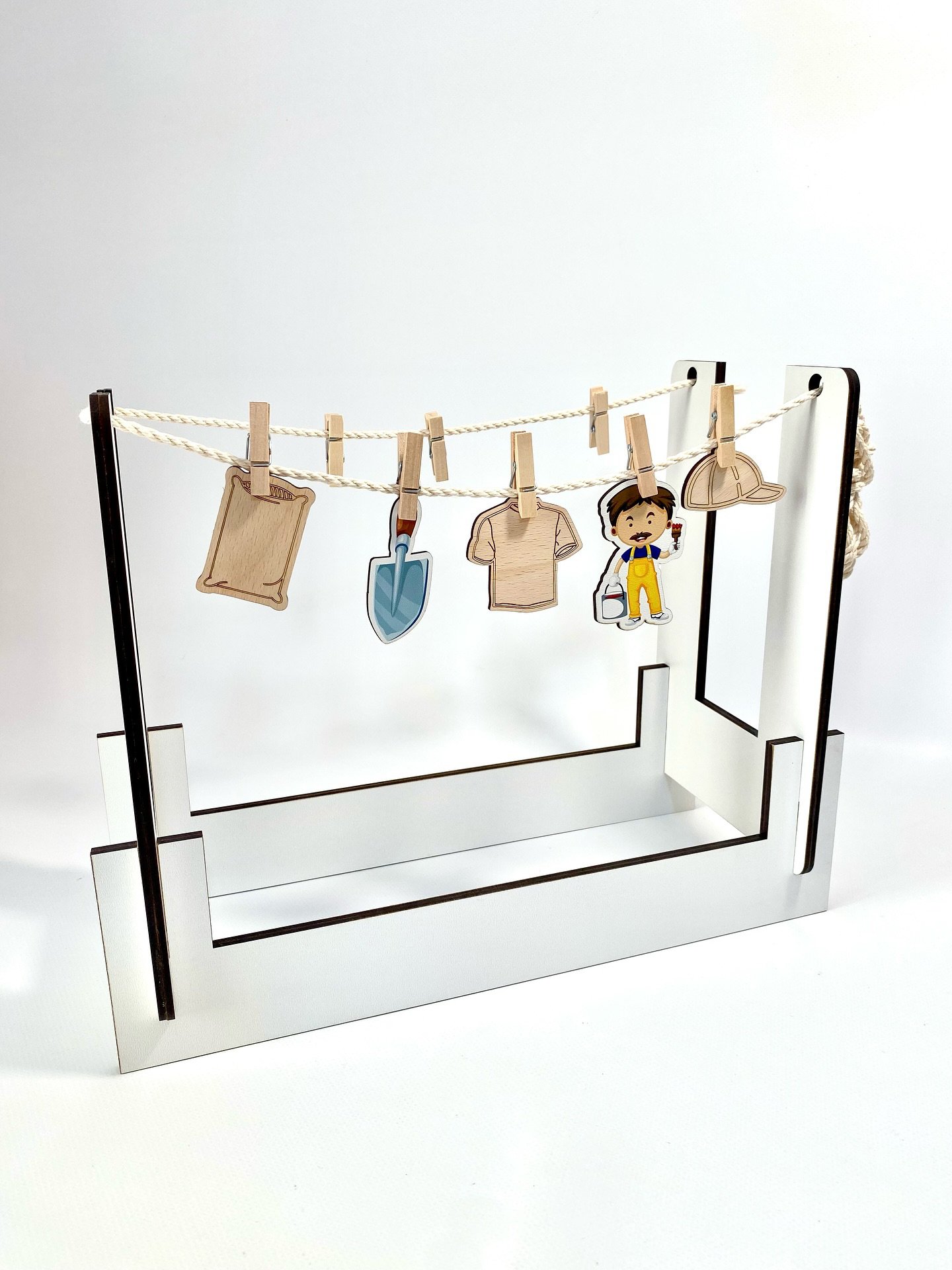 ✔️ siužetinio–vaidmeninio žaidimo įgūdžius (išskalbti drabužius ir iškabinti juos segtukais ant virvelės);