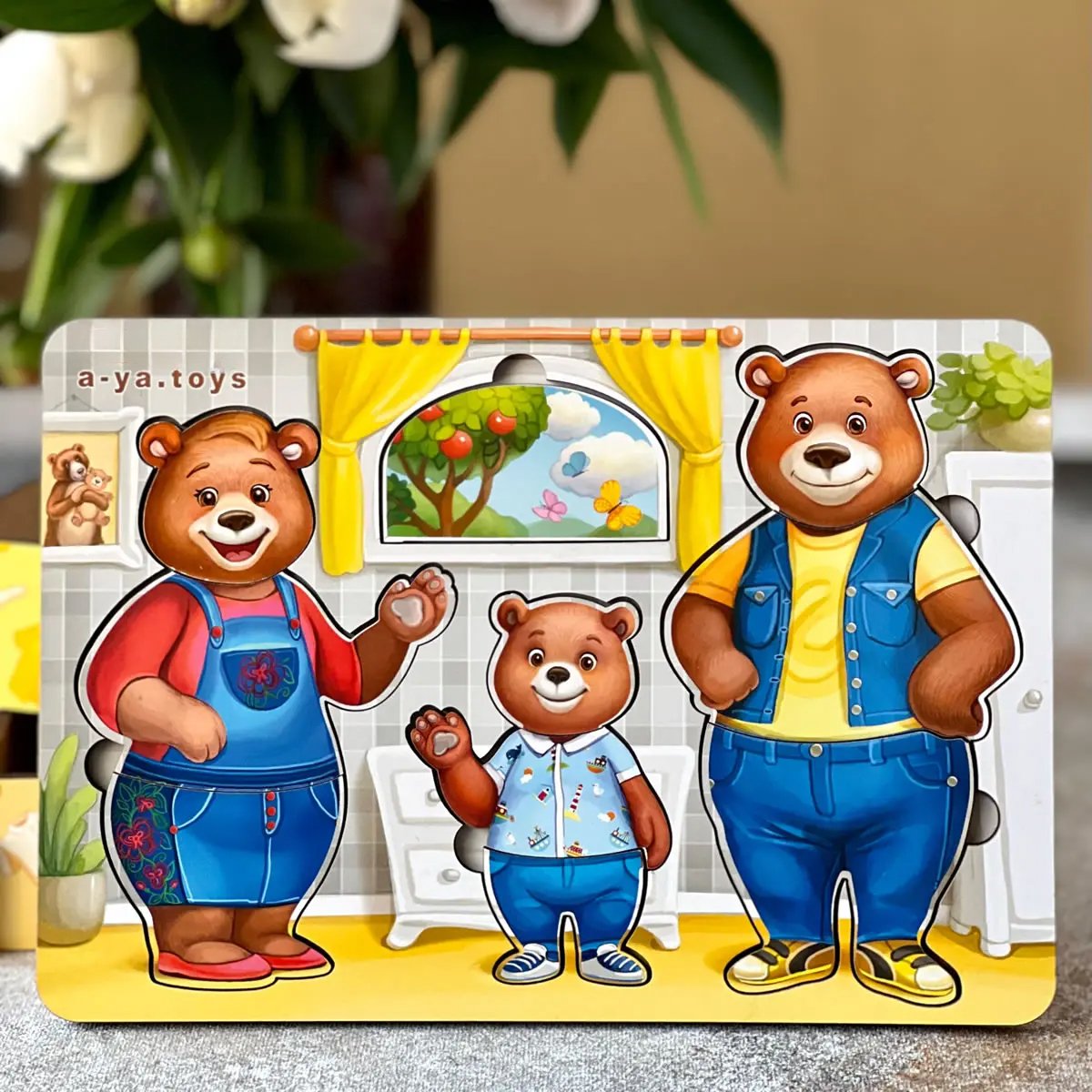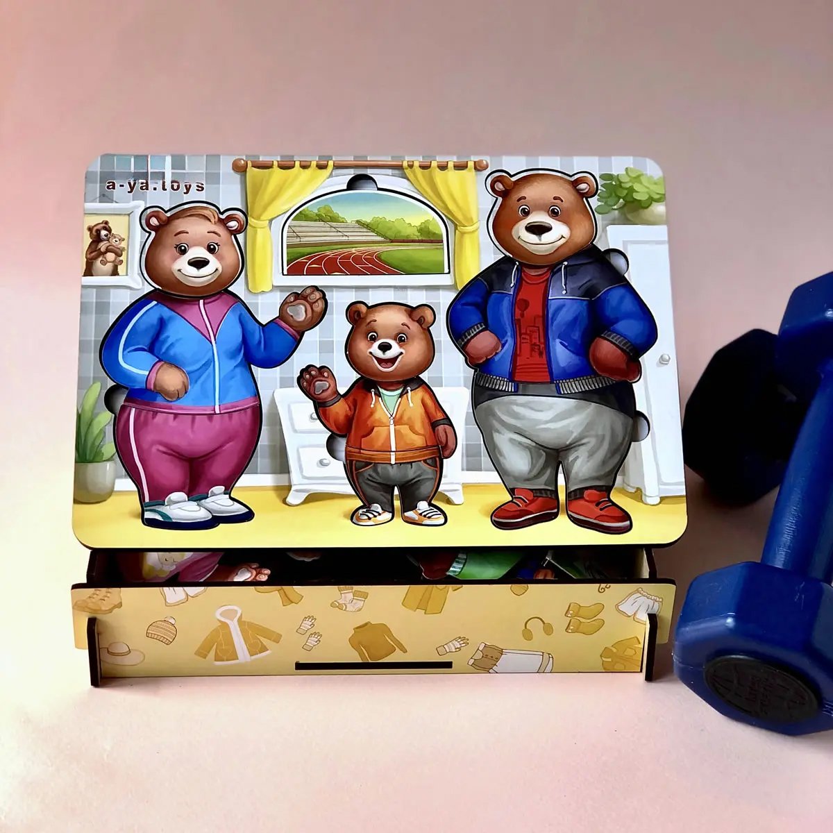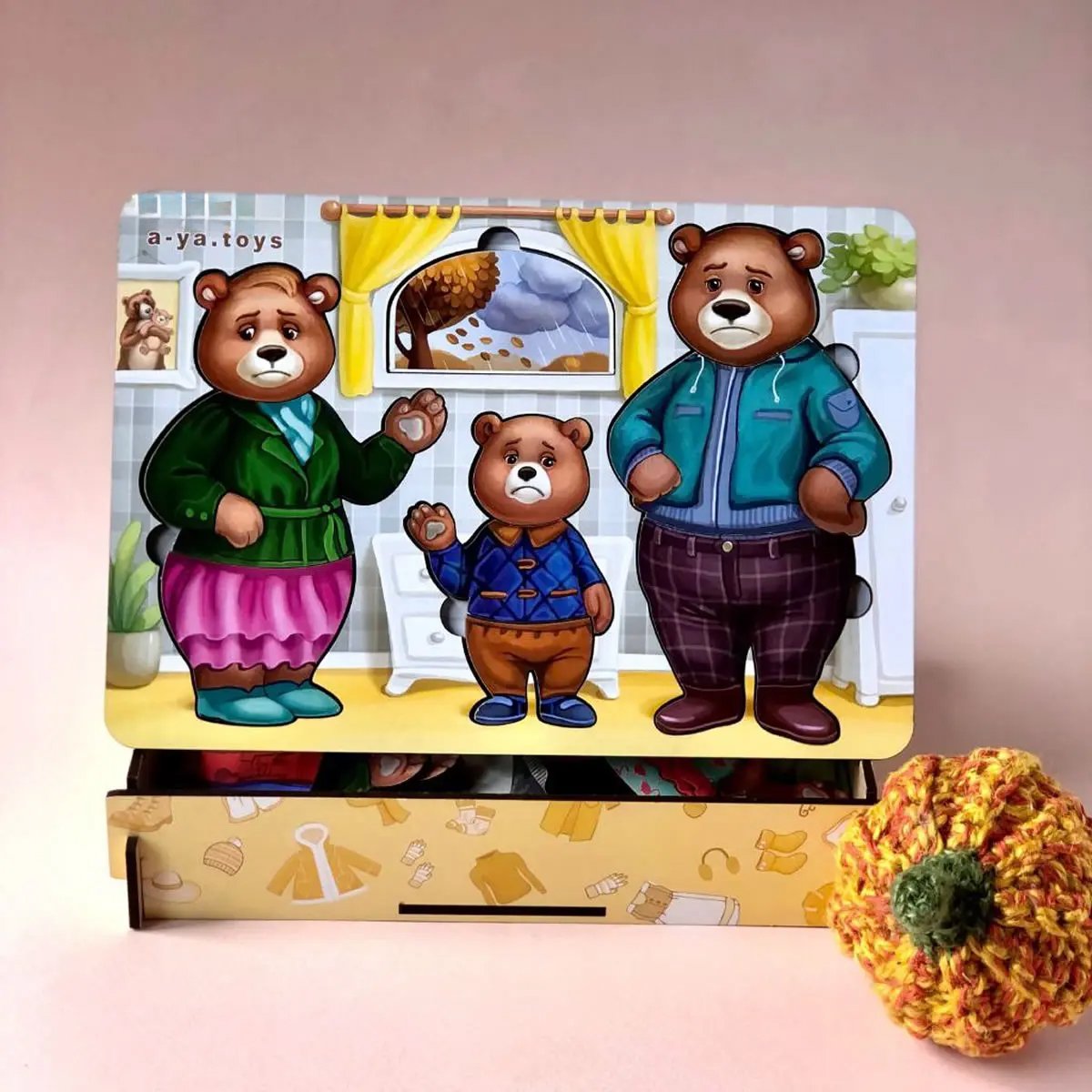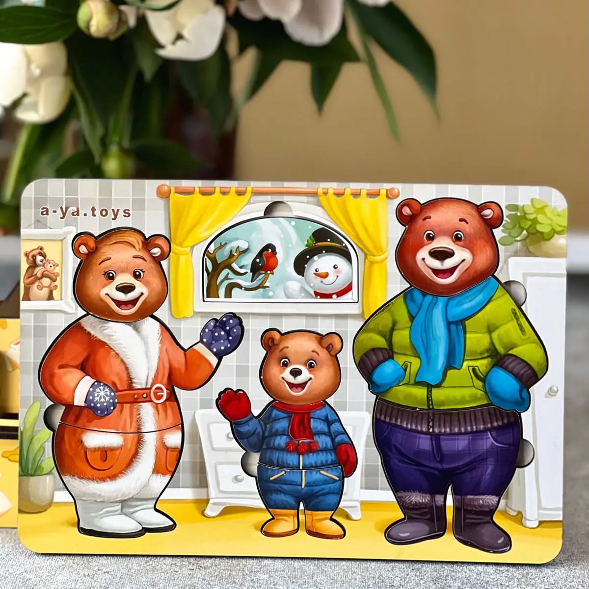 • 3 meškučių figūrėlės (mama, tėtis, mažylis)