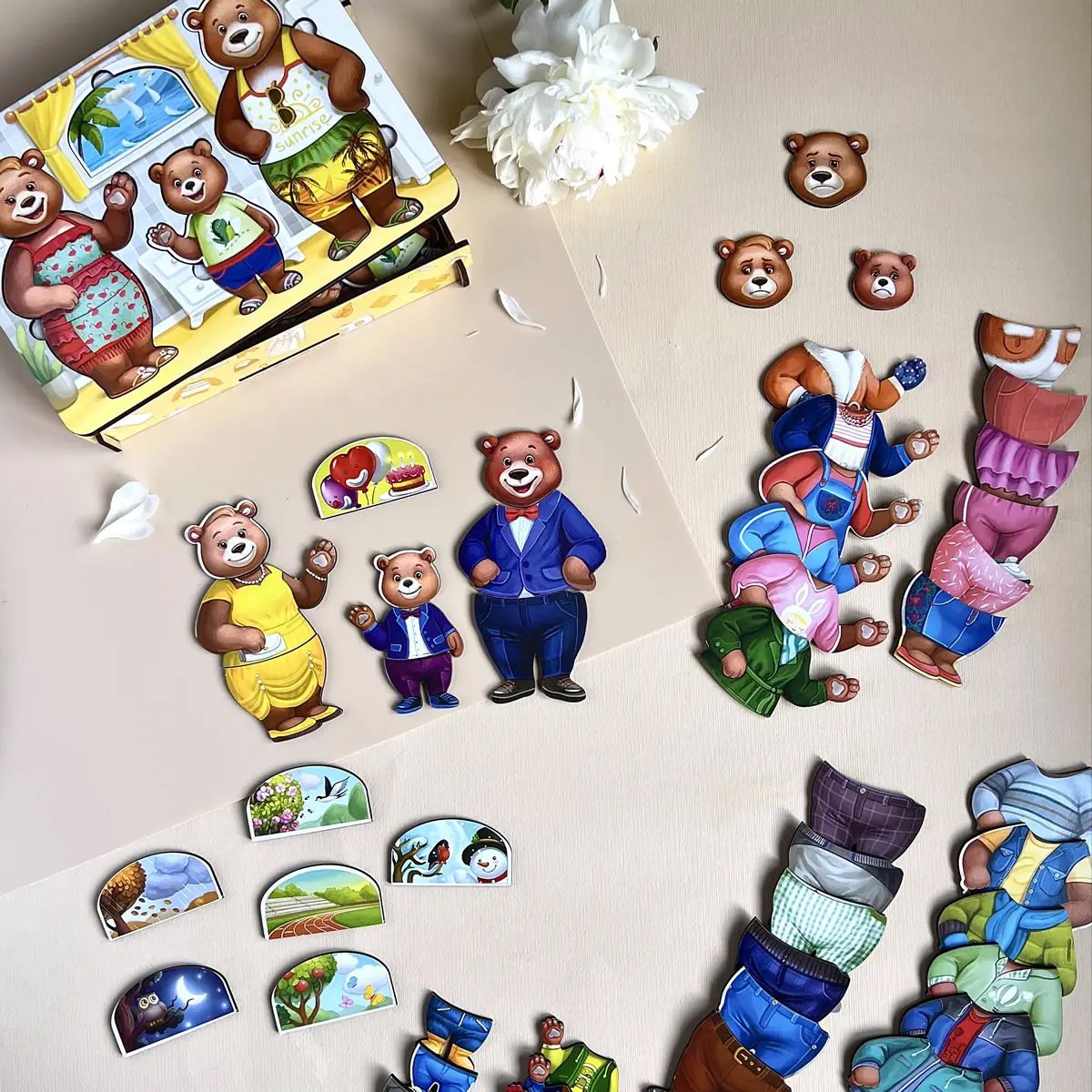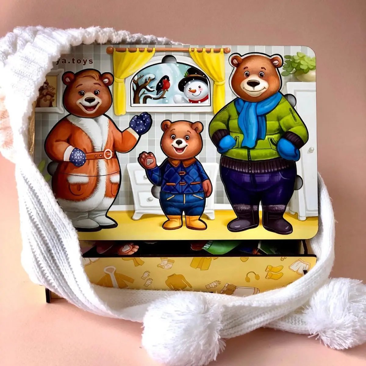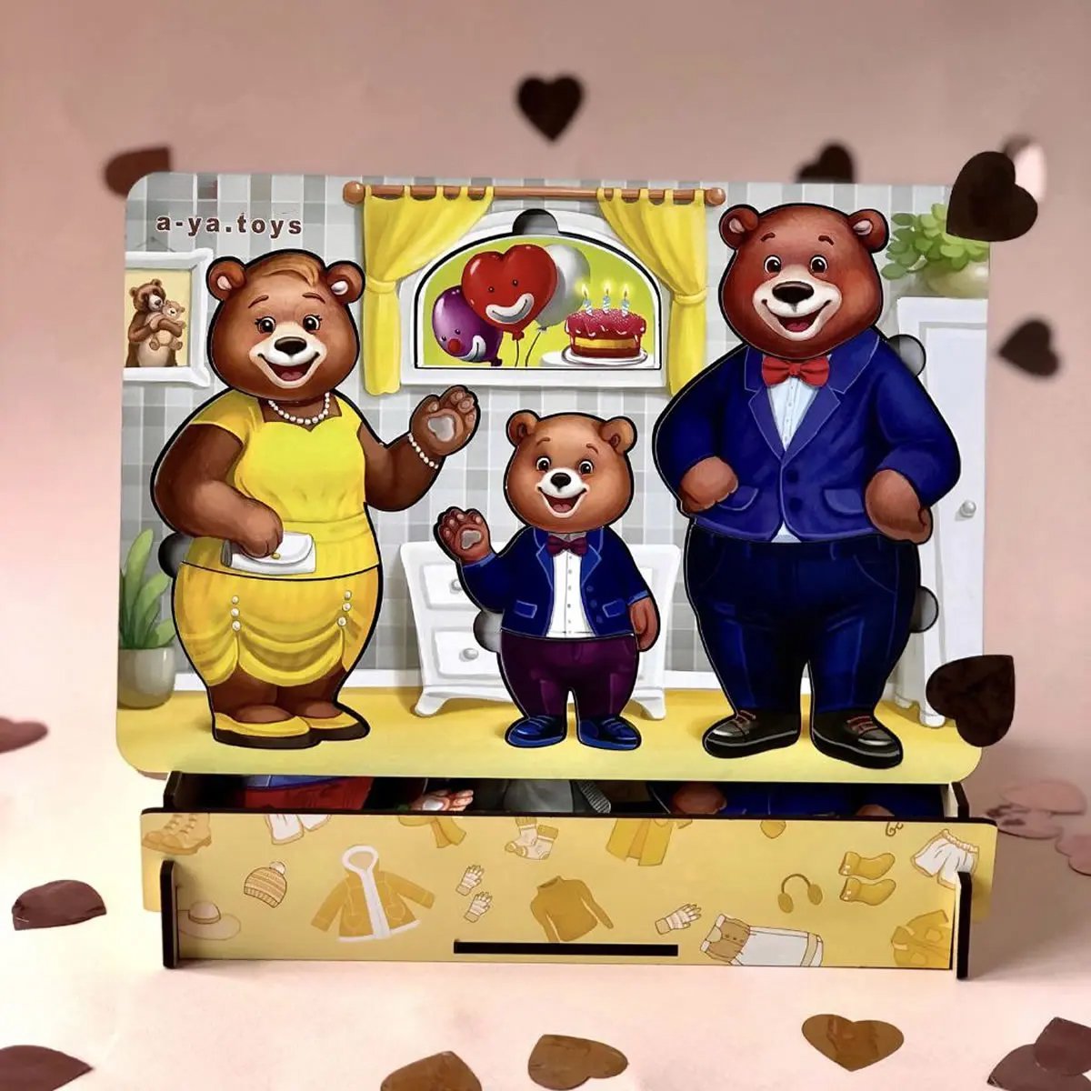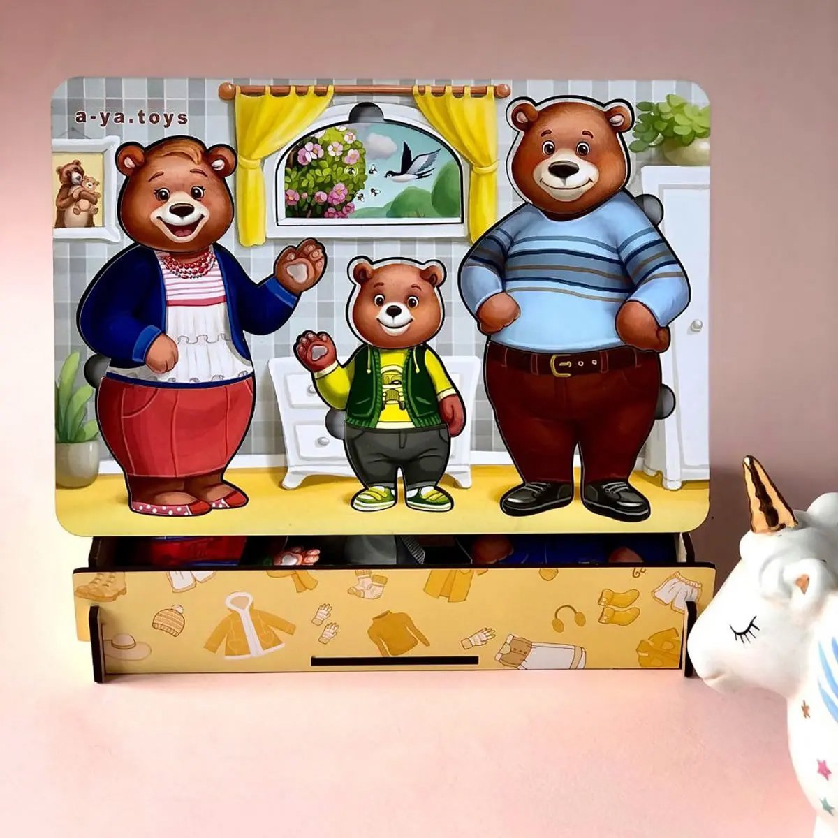• 3 meškučių figūrėlės (mama, tėtis, mažylis)
