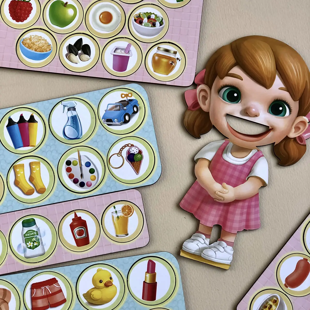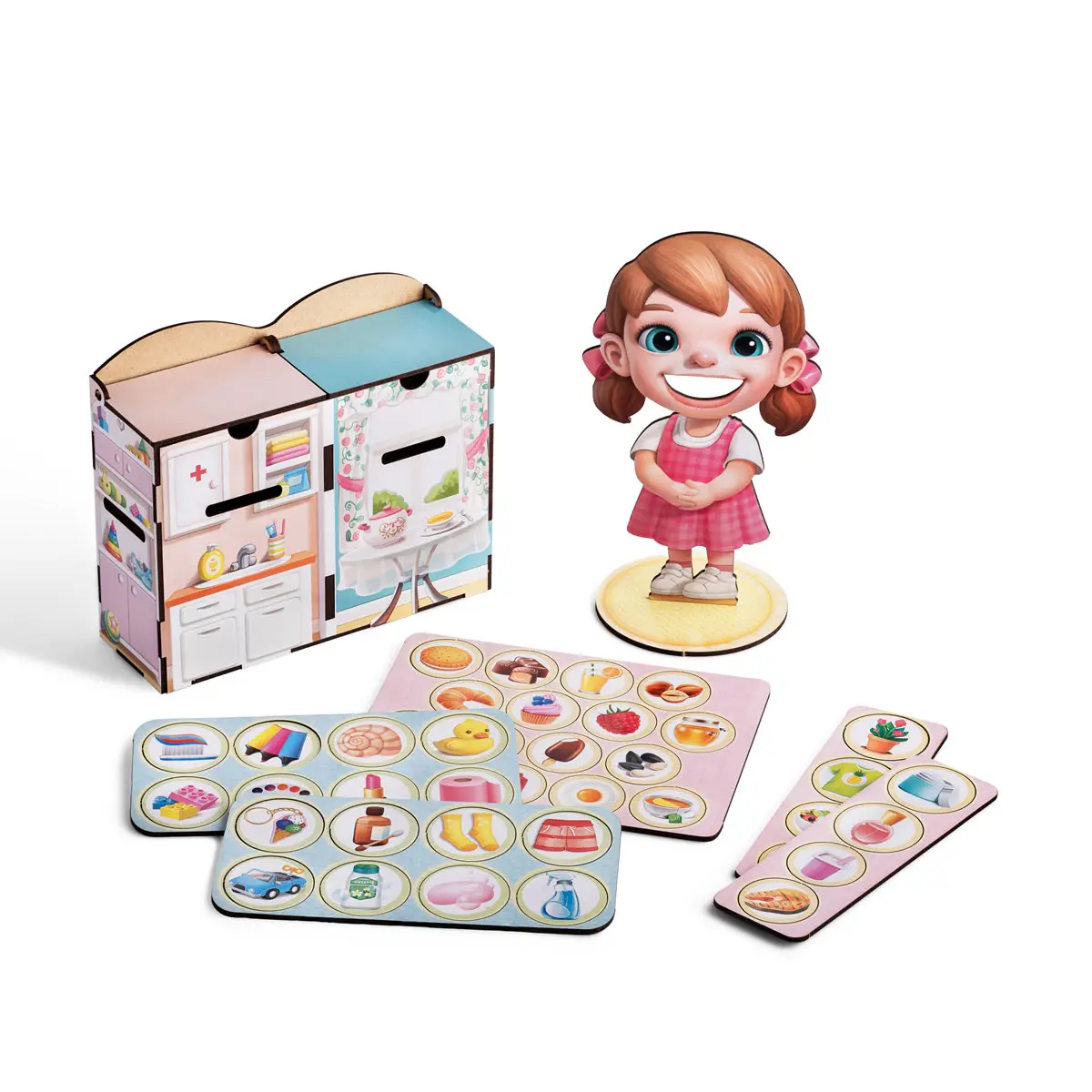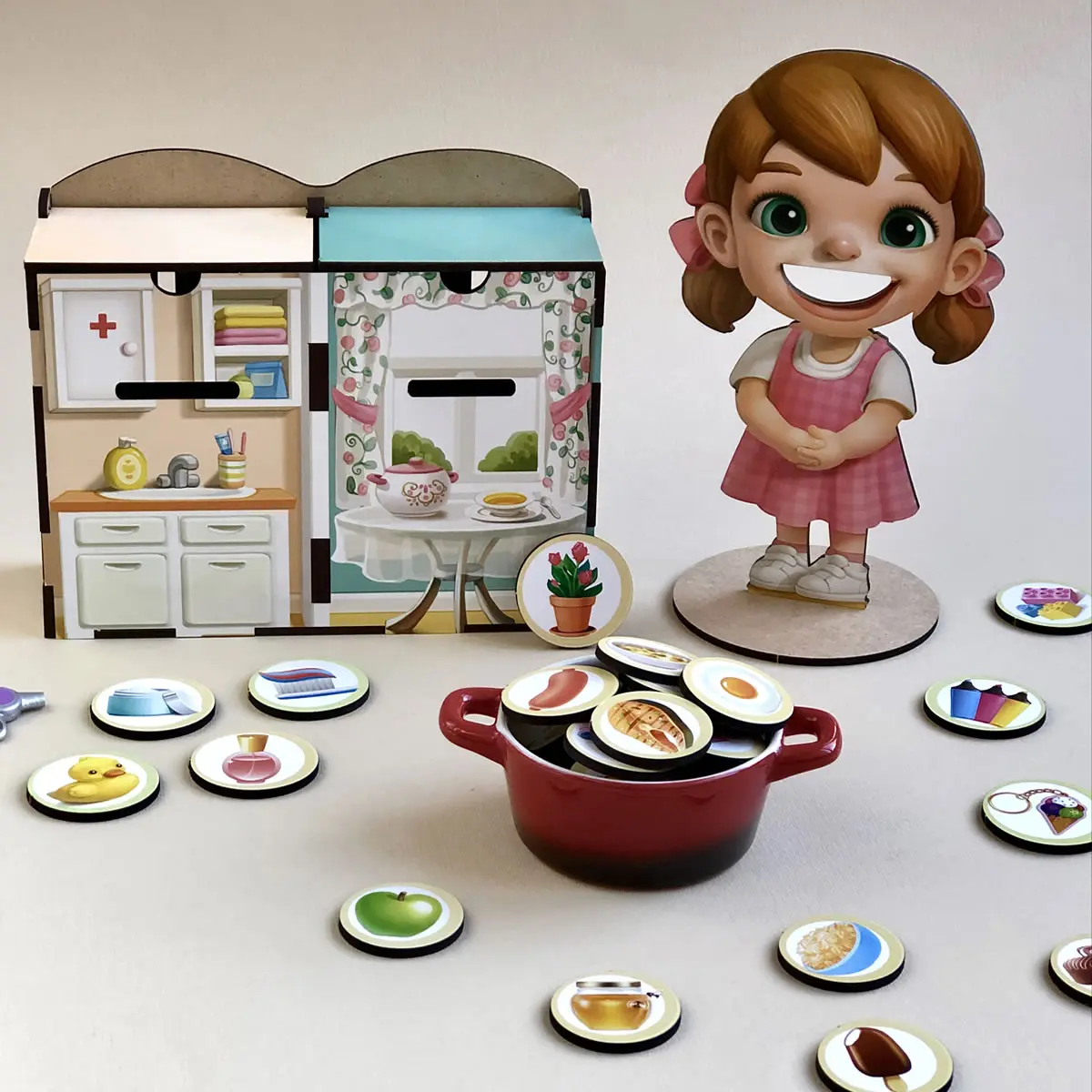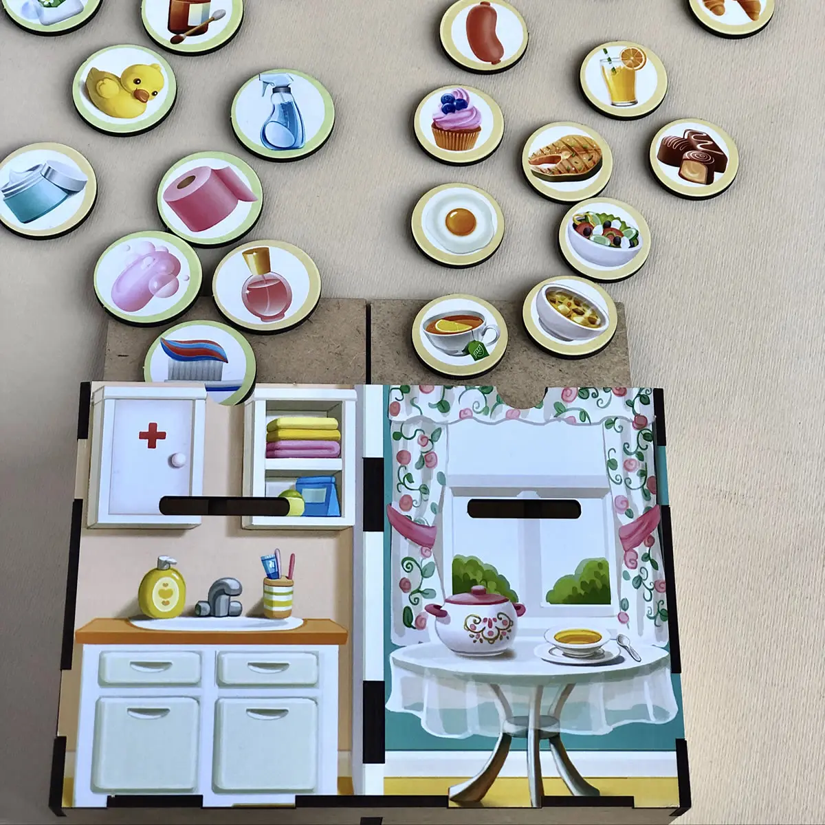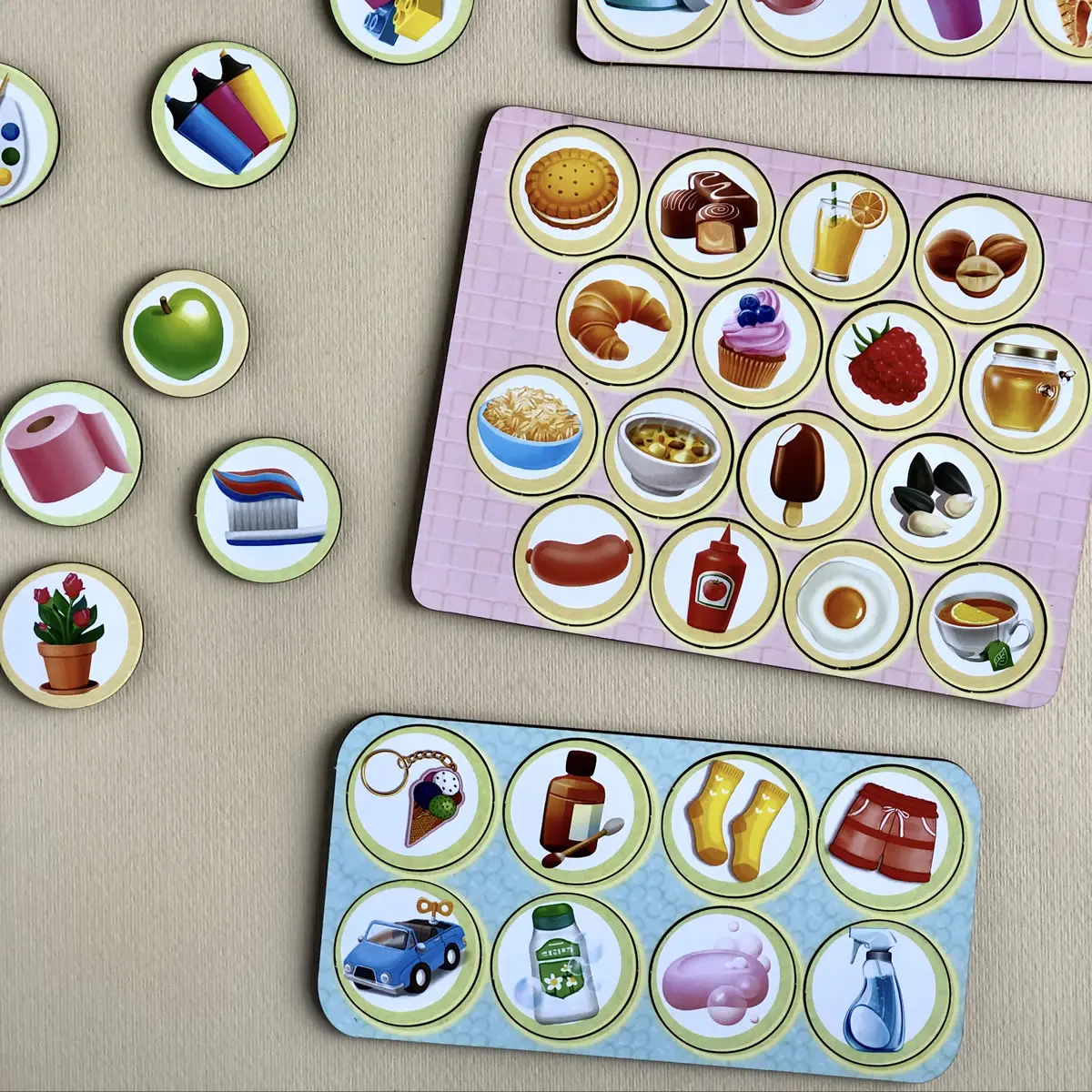 Rinkinyje – 40 medinių kortelių su įvairiais daiktais: nuo maisto iki dantų pastos, nuo kojinių iki žaislų.