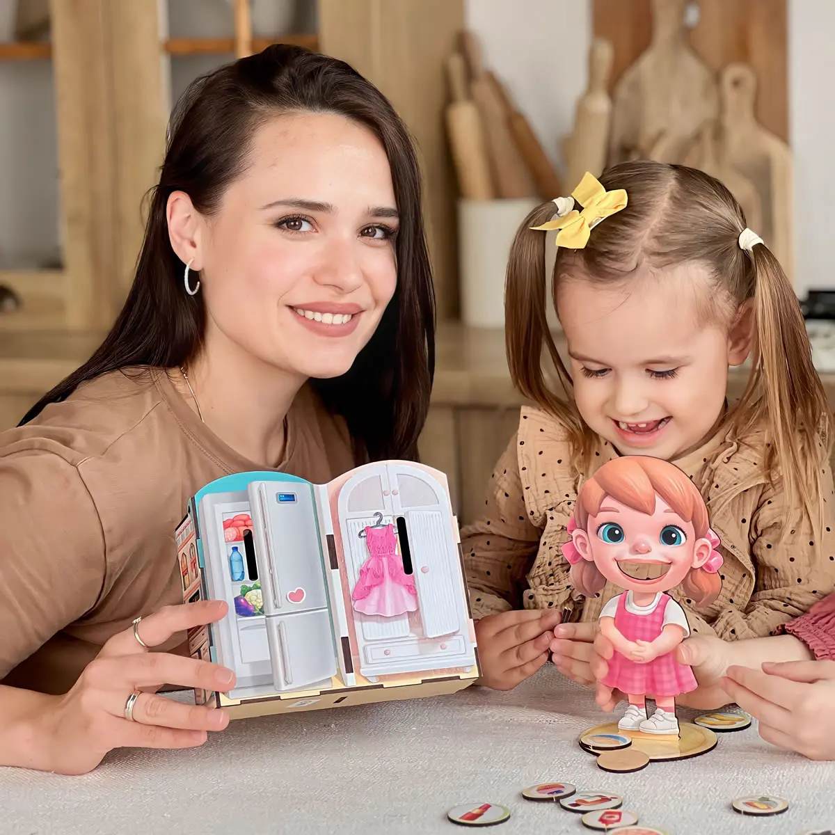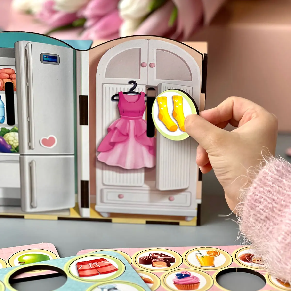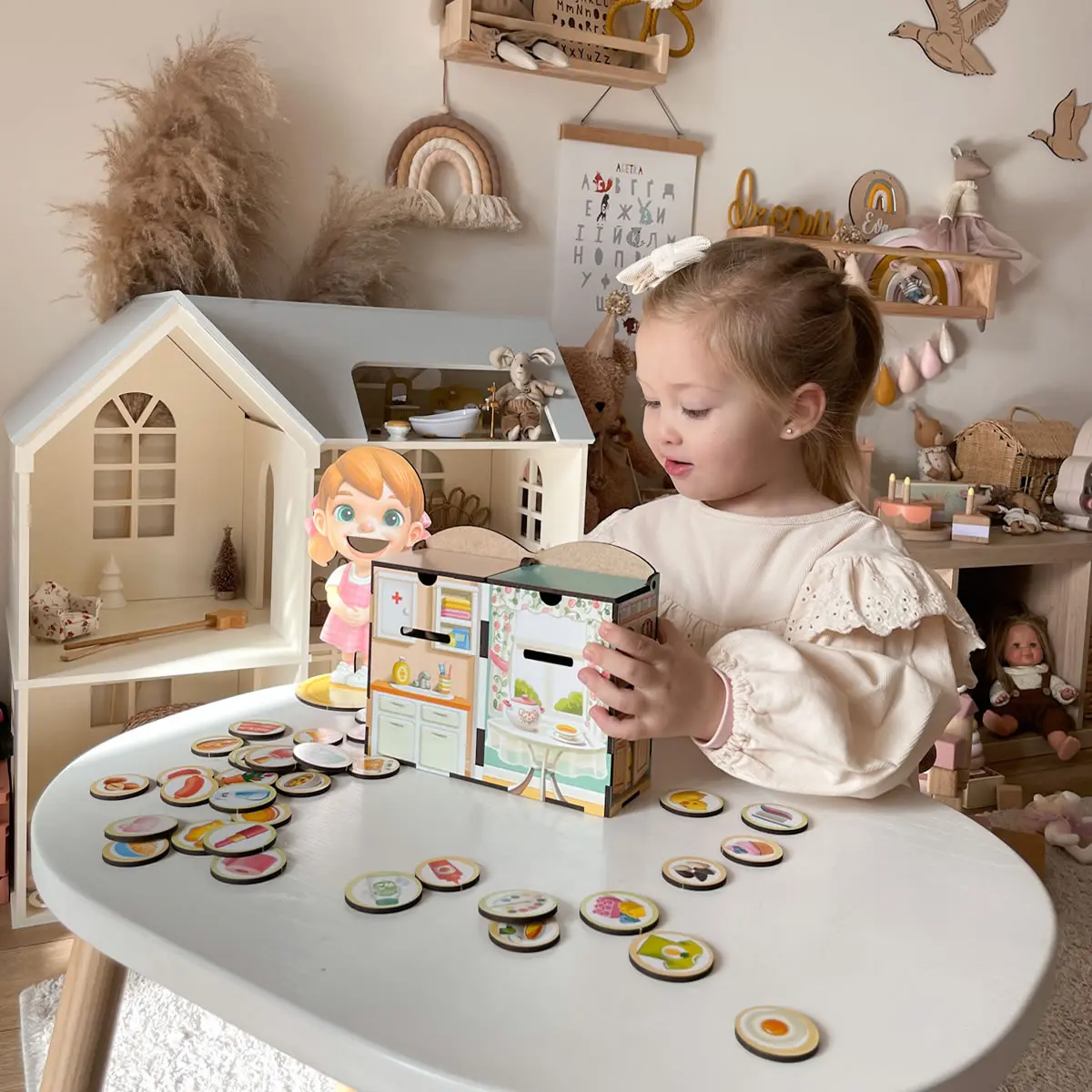 🧩 Prieš vaiką – erdvi medinė komodėlė su penkiais teminiais skyreliais: virtuvė, vonia, žaislų spinta, valgomasis stalas ir drabužių spinta.