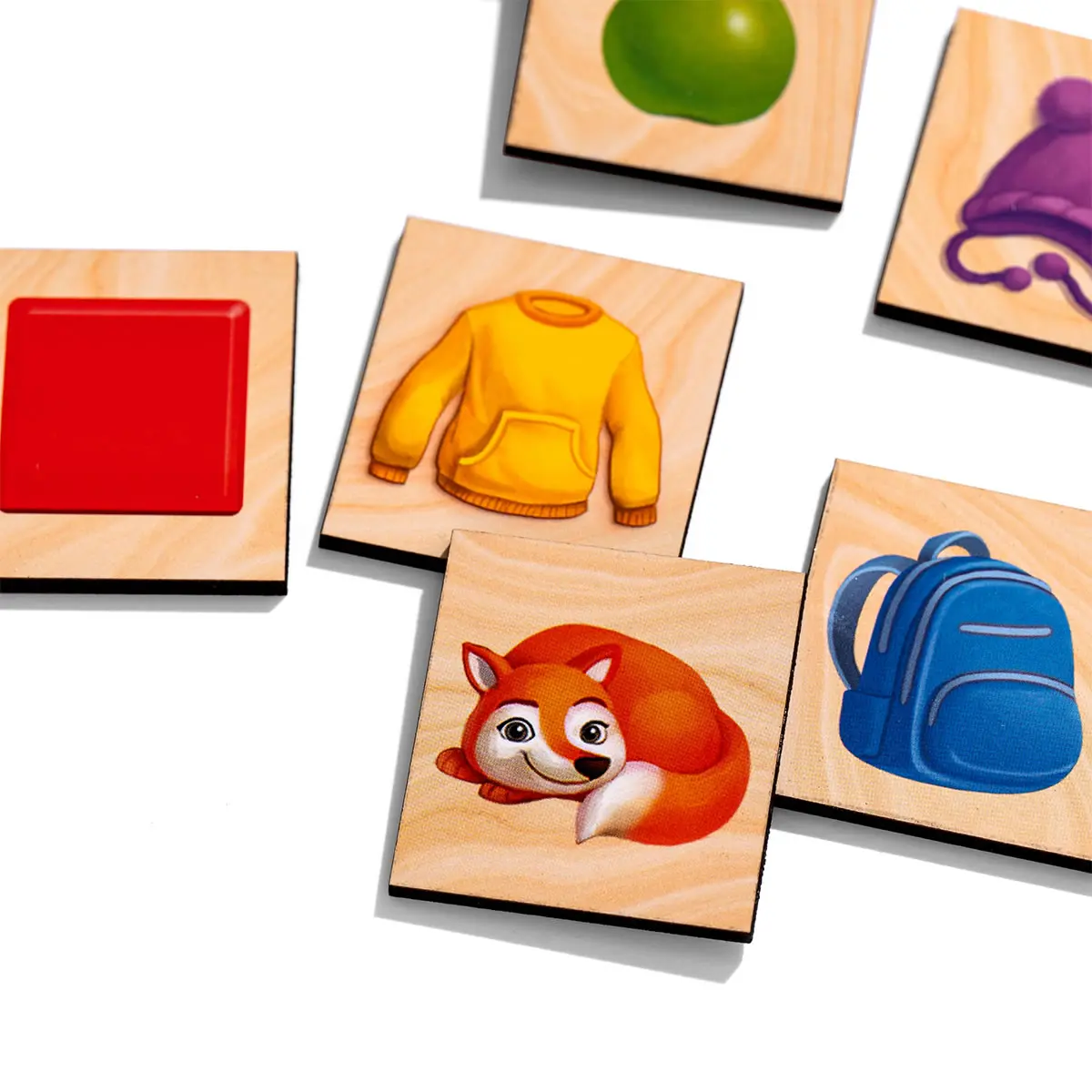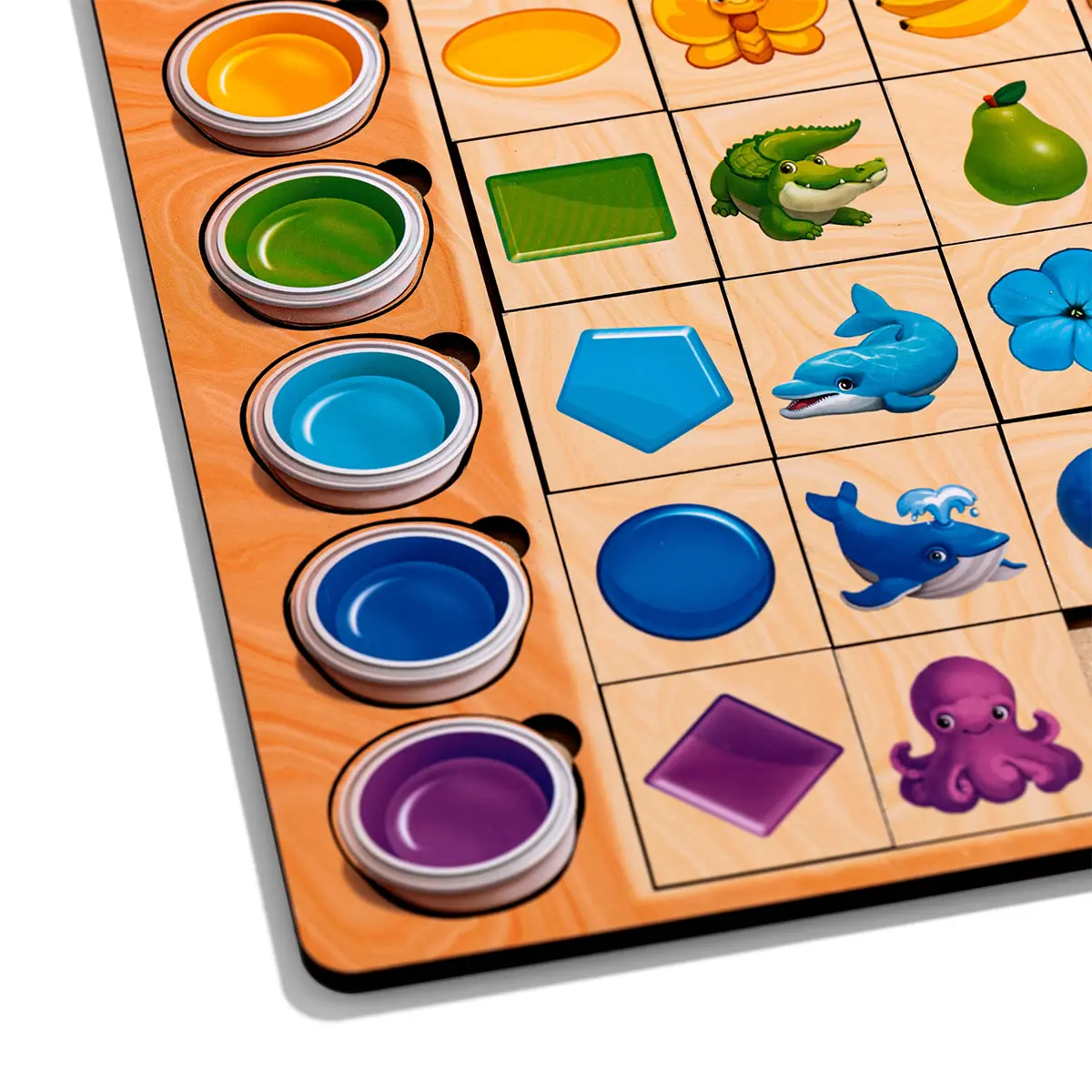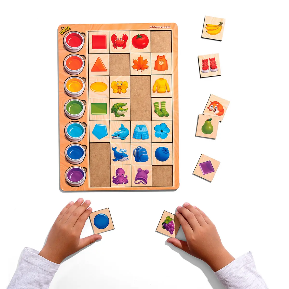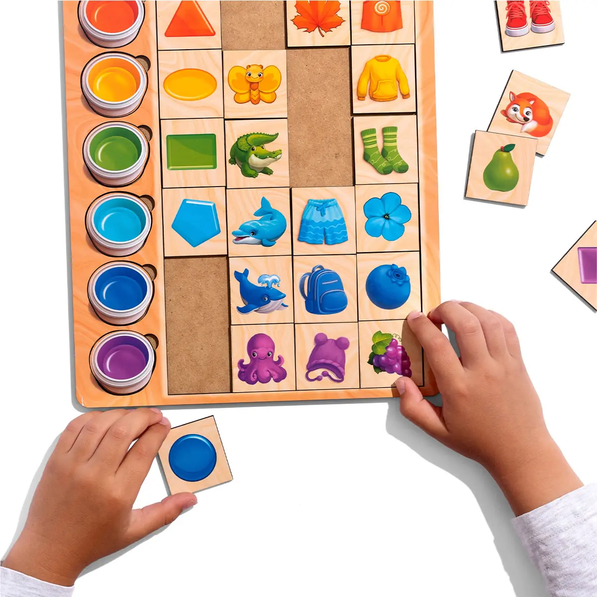 Šiame žaidime vaikas ne tik derina atspalvius, bet ir atpažįsta daiktus, lygina, klasifikuoja ir kuria vizualinę logiką.