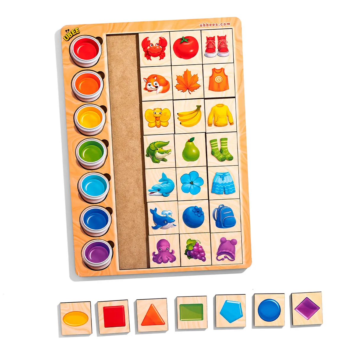 • Medinė pagrindo lentelė su 7 spalvingais indeliais (spalvų kategorijomis)