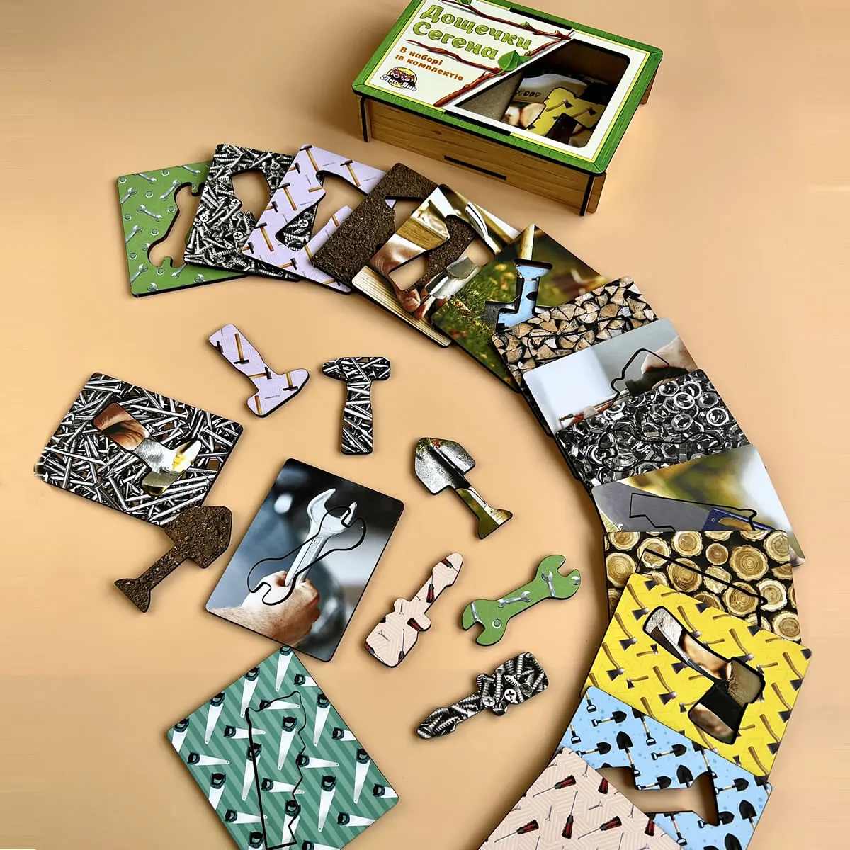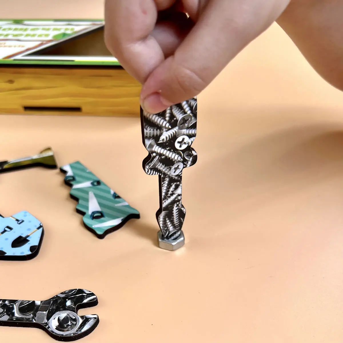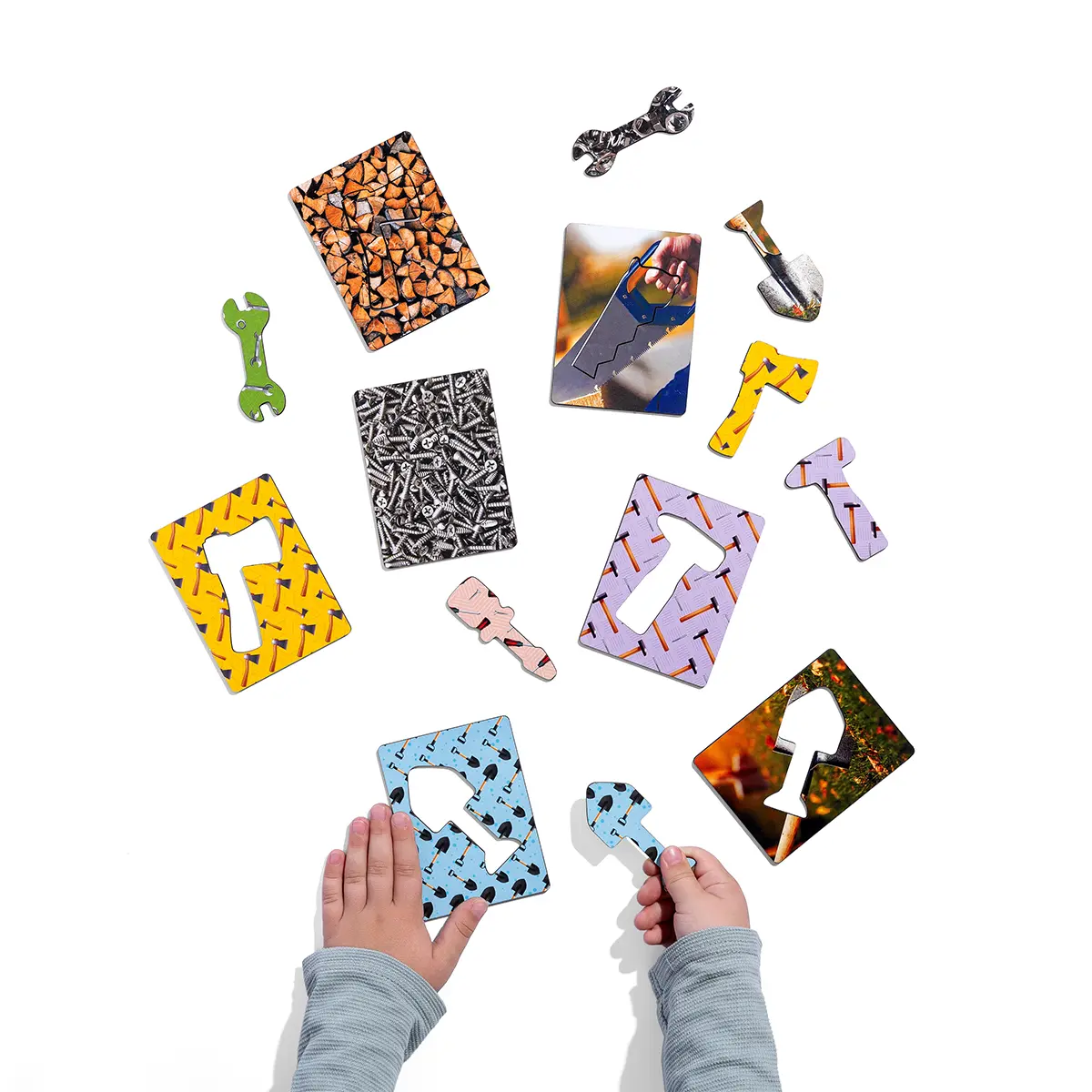 • 9 figūriniai įdėklai (plaktukas, pjūklas, kirvis, raktas ir kt.)